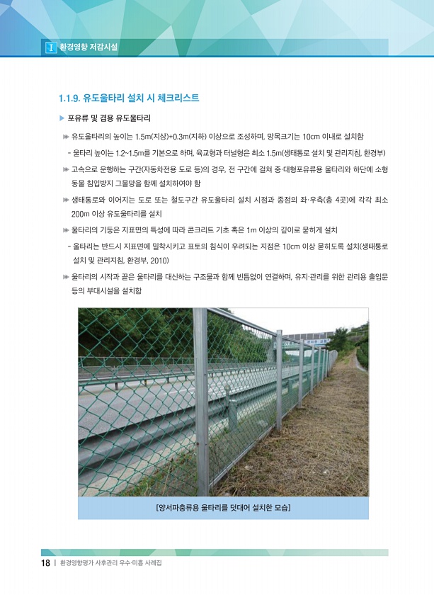 Ⅰ 환경영향 저감시설 18 | 환경영향평가 사후관리 우수 · 미흡 사례집 1.1.9. 유도울타리 설치 시 체크리스트 ▶ 포유류 및 겸용 유도울타리 유도울타리의 높이는 1.5m 지상 +0.3m 지하 이상으로 조성하며, 망목크기는 10cm 이내로 설치함 울타리 높이는 1.21.5m를 기본으로 하며, 육교형과 터널형은 최소 1.5m 생태통로 설치 및 관리지침, 환경부 고속으로 운행하는 구간 자동차전용 도로 등 의 경우, 전 구간에 걸쳐 중·대형포유류용 울타리와 하단에 소형 동물 침입방지 그물망을 함께 설치하여야 함 생태통로와 이어지는 도로 또는 철도구간 유도울타리 설치 시점과 종점의 좌·우측 총 4곳 에 각각 최소 200m 이상 유도울타리를 설치 울타리의 기둥은 지표면의 특성에 따라 콘크리트 기초 혹은 1m 이상...