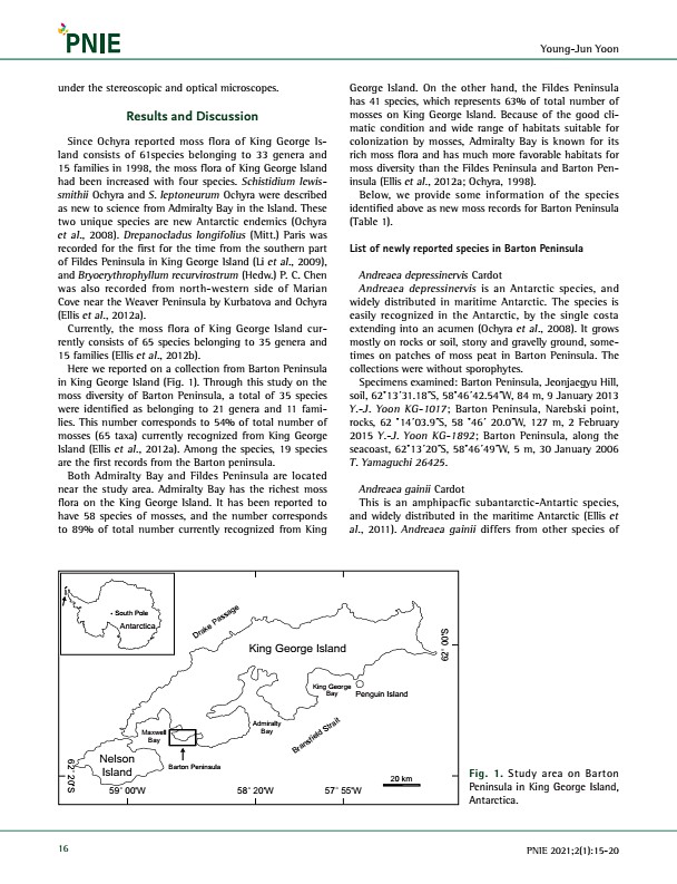 Young-Jun Yoon 16 PNIE 2021;2 1 15-20 under the stereoscopic and optical microscopes. Results and Discussion Since Ochyra reported moss flora of King George Island consists of 61species belonging to 33 genera and 15 families in 1998, the moss flora of King George Island had been increased with four species. Schistidium lewissmithii Ochyra and S. leptoneurum Ochyra were described as new to science ...