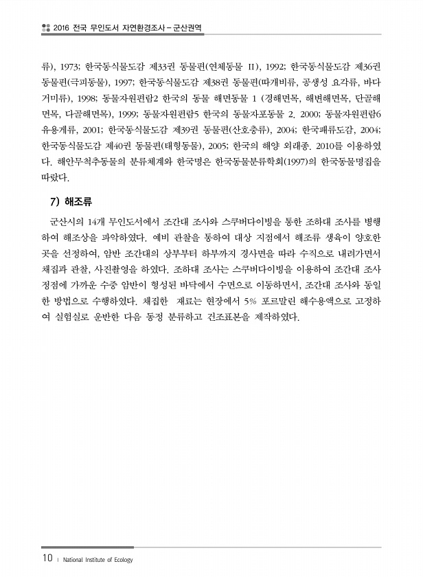 2016 전국 무인도서 자연환경조사 군산권역 10 ? National Institute of Ecology 류 , 1973; 한국동식물도감 제33권 동물편 연체동물 Ⅱ , 1992; 한국동식물도감 제36권 동물편 극피동물 , 1997; 한국동식물도감 제38권 동물편 따개비류, 공생성 요각류, 바다 거미류 , 1998; 동물자원편람2 한국의 동물 해면동물 1 경해면목, 해변해면목, 단골해 면목, 다골해면목 , 1999; 동물자원편람5 한국의 동물자포동물 2. 2000; 동물자원편람6 유용게류, 2001; 한국동식물도감 제39권 동물편 산호충류 , 2004; 한국패류도감, 2004; 한국동식물도감 제40권 동물편 태형동물 , 2005; 한국의 해양 외래종. 2010를 이용하였 다. 해안무척추동물의 분류체계와 한...