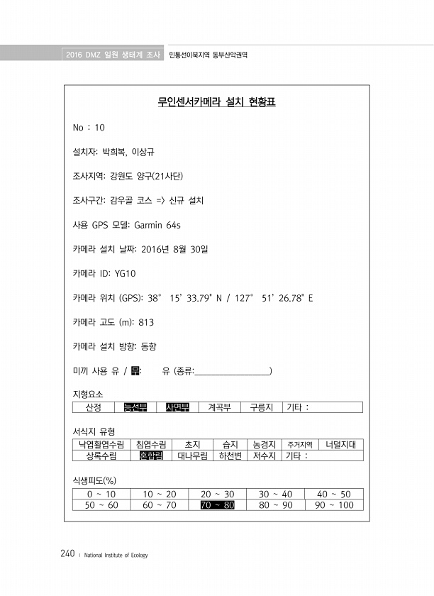 2016 DMZ 일원 생태계 조사 민통선이북지역 동부산악권역 240 ? National Institute of Ecology 무인센서카메라 설치 현황표 No 10 설치자박희복, 이상규 조사지역강원도 양구 21사단 조사구간감우골 코스 = 신규 설치 사용 GPS 모델Garmin 64s 카메라 설치 날짜2016년 8월 30일 카메라 IDYG10 카메라 위치 GPS 38° 15’ 33.79N 127° 51’ 26.78E 카메라 고도 m 813 카메라 설치 방향동향 미끼 사용 유 무유 종류__________________ 지형요소 산정 능선부 사면부 계곡부 구릉지 기타 서식지 유형 낙엽활엽수림 침엽수림 초지 습지 농경지 주거지역 너덜지대 상록수림 혼합림 대나무림 하천변 저수지 기타 식생피도 % 0 10 10 20 2...