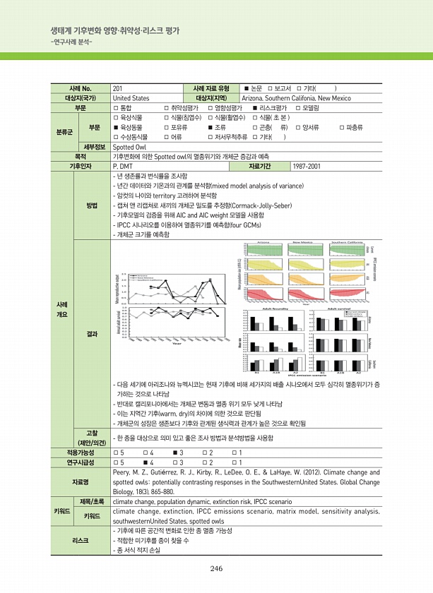 246 생태계 기후변화 영향·취약성·리스크 평가 -연구사례 분석- 사례 No. 201 사례 자료 유형 ■ 논문 □ 보고서 □ 기타 대상지 국가 United States 대상지 지역 Arizona, Southern Califonia, New Mexico 부문 □ 통합 □ 취약성평가 □ 영향성평가 ■ 리스크평가 □ 모델링 분류군 부문 □ 육상식물 □ 식물 침엽수 □ 식물 활엽수 □ 식물 초 본 ■ 육상동물 □ 포유류 ■ 조류 □ 곤충 류 □ 양서류 □ 파충류 □ 수상동식물 □ 어류 □ 저서무척추류 □ 기타 세부정보 Spotted Owl 목적 기후변화에 의한 Spotted owl의 멸종위기와 개체군 증감과 예측 기후인자 P, DMT 자료기간 1987-2001 사례 개요 방법 년 생존률과 번식률을 조사함 년간 데이...
