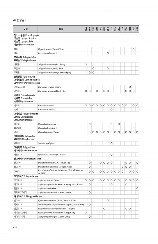 246 4 충청남도 국명 학명 계 룡 공주 금산 논산 당진 보령 부여 서산 서천 아산 예산 천안 청양 태안 홍성 양치식물문 Pteridophyta 석송강 Lycopodiopsida 석송목 Lycopodiales 석송과 Lycopodiaceae 뱀톱 Huperzia serrata Thunb. Trevis. ○ 석송 Lycopodium clavatum L. ○ 부처손목 Selaginellales 부처손과 Selaginellaceae 바위손 Selaginella involvens Sw. Spring ○ 구실사리 Selaginella rossii Baker Warb. ○ ○ 부처손 Selaginella tamariscina P. Beauv. Spring ○ ○ 솔잎난강 Psilotopsida 고사리삼목 Ophiog...