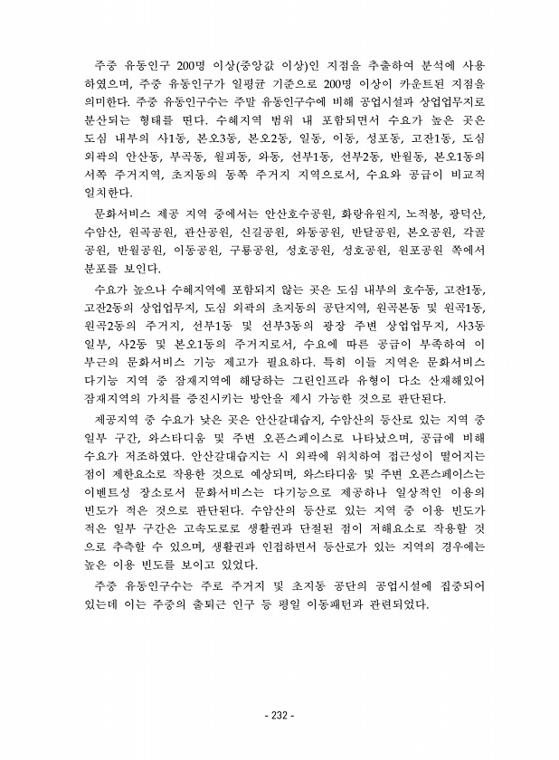 주중 유동인구 200명 이상 중앙값 이상 인 지점을 추출하여 분석에 사용 하였으며, 주중 유동인구가 일평균 기준으로 200명 이상이 카운트된 지점을 의미한다. 주중 유동인구수는 주말 유동인구수에 비해 공업시설과 상업업무지로 분산되는 형태를 띤다. 수혜지역 범위 내 포함되면서 수요가 높은 곳은 도심 내부의 사1동, 본오3동, 본오2동, 일동, 이동, 성포동, 고잔1동, 도심 외곽의 안산동, 부곡동, 월피동, 와동, 선부1동, 선부2동, 반월동, 본오1동의 서쪽 주거지역, 초지동의 동쪽 주거지 지역으로서, 수요와 공급이 비교적 일치한다. 문화서비스 제공 지역 중에서는 안산호수공원, 화랑유원지, 노적봉, 광덕산, 수암산, 원곡공원, 관산공원, 신길공원, 와동공원, 반달공원, 본오공원, 각골 공원, 반월공원, 이동...