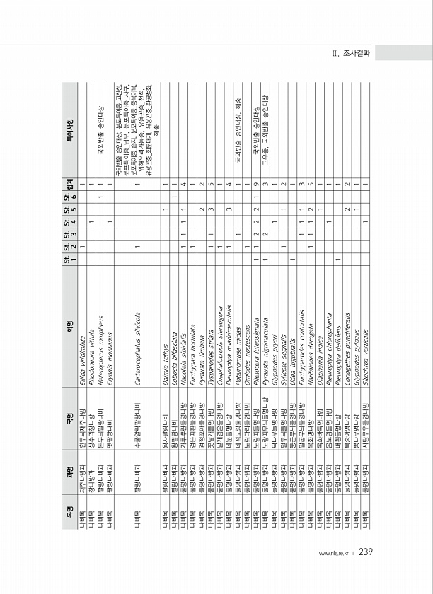 239 목명 과명 국명 학명 St. 1 St. 2 St. 3 St. 4 St. 5 St. 6 합계 특이사항 나비목 재주나방과 흰무늬재주나방 Ellida viridimixta 1 1 나비목 창나방과 상수리창나방 Rhodoneura vittula 1 1 나비목 팔랑나비과 돈무늬팔랑나비 Heteropterus morpheus 1 1 국외반출 승인대상 나비목 팔랑나비과 멧팔랑나비 Erynnis montanus 1 1 나비목 팔랑나비과 수풀알락팔랑나비 Carterocephalus silvicola 1 1 국외반출 승인대상, 분포특이종_고산성, 분포특이종_남부, 분포특이종_사구, 분포특이종_습지, 분포특이종_중북이북, 위해우려가능종, 유용곤충_천적, 유용곤충_화분매개, 유용곤충_환경정화, 해충 나비목 팔랑나비과 왕자팔...
