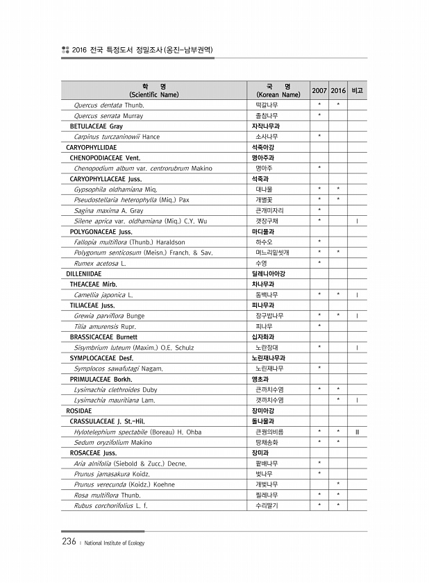 2016 전국 특정도서 정밀조사 옹진-남부권역 236 ? National Institute of Ecology 학 명 Scientific Name 국 명 Korean Name 2007 2016 비고 Quercus dentata Thunb. 떡갈나무 * * Quercus serrata Murray 졸참나무 * BETULACEAE Gray 자작나무과 Carpinus turczaninowii Hance 소사나무 * CARYOPHYLLIDAE 석죽아강 CHENOPODIACEAE Vent. 명아주과 Chenopodium album var. centrorubrum Makino 명아주 * CARYOPHYLLACEAE Juss. 석죽과 Gypsophila oldhamiana Miq. 대나물 * * Pseudostellar...