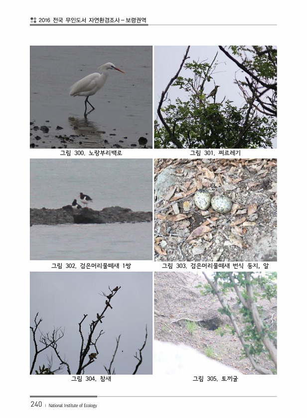 2016 전국 무인도서 자연환경조사 보령권역 240 ? National Institute of Ecology 그림 300. 노랑부리백로 그림 301. 찌르레기 그림 302. 검은머리물떼새 1쌍 그림 303. 검은머리물떼새 번식 둥지, 알 그림 304. 참새 그림 305.토끼굴