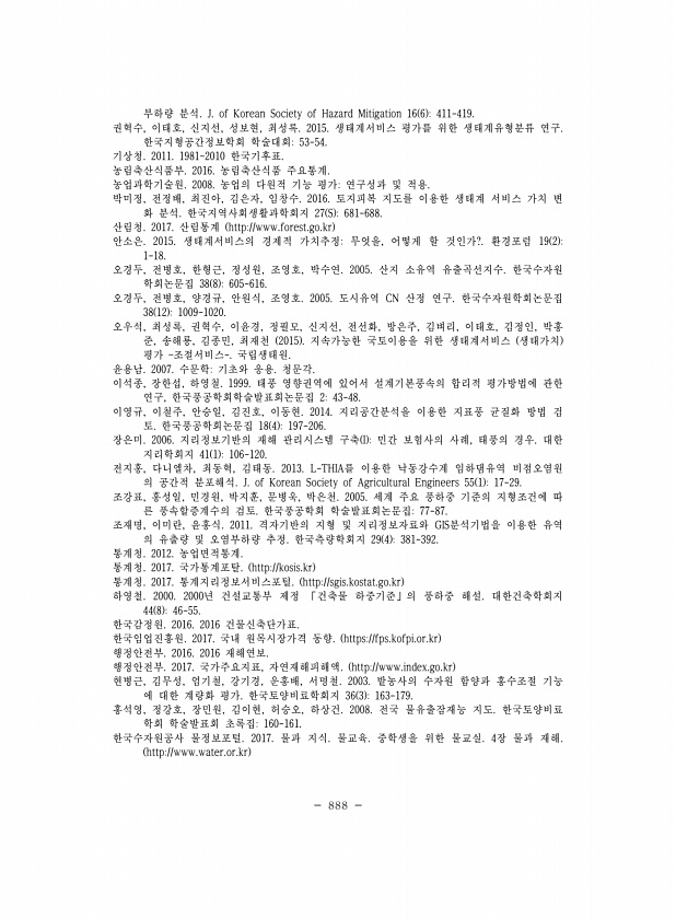 888 부하량 분석. J. of Korean Society of Hazard Mitigation 16 6 411-419. 권혁수, 이태호, 신지선, 성보현, 최성록. 2015. 생태계서비스 평가를 위한 생태계유형분류 연구. 한국지형공간정보학회 학술대회53-54. 기상청. 2011. 19812010 한국기후표. 농림축산식품부. 2016. 농림축산식품 주요통계. 농업과학기술원. 2008. 농업의 다원적 기능 평가연구성과 및 적용. 박미정, 전정배, 최진아, 김은자, 임창수. 2016. 토지피복 지도를 이용한 생태계 서비스 가치 변 화 분석. 한국지역사회생활과학회지 27 S 681-688. 산림청. 2017. 산림통계 http//www.forest.go.kr 안소은. 2015. 생태계서비스의 경제적 가치추정무엇을...