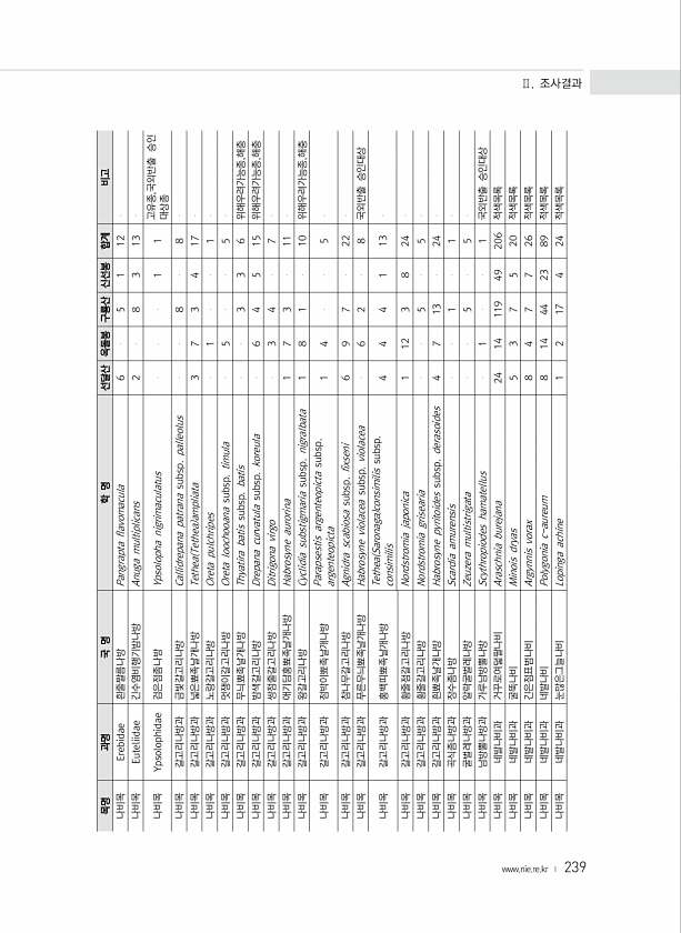 239 목명 과명 국 명 학 명 선달산 옥돌봉 구룡산 신선봉 합계 비고 나비목 Erebidae 흰줄짤름나방 Pangrapta flavomacula 6 5 1 12 나비목 Euteliidae 긴수염비행기밤나방 Anuga multiplicans 2 8 3 13 나비목 Ypsolophidae 검은점좀나방 Ypsolopha nigrimaculatus 1 1 고유종,국외반출 승인 대상종 나비목 갈고리나방과 금빛갈고리나방 Callidrepana patrana subsp. palleolus 8 8 나비목 갈고리나방과 넓은뾰족날개나방 Tethea Tethea ampliata 3 7 3 4 17 나비목 갈고리나방과 노랑갈고리나방 Oreta pulchripes 1 1 ...