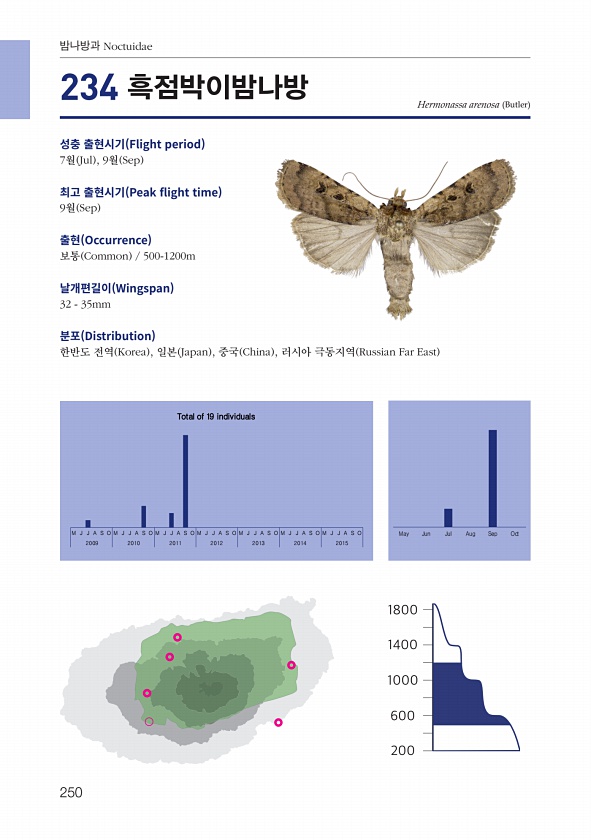 250 밤나방과 Noctuidae Hermonassa arenosa Butler 성충 출현시기 Flight period 7월 Jul , 9월 Sep 최고 출현시기 Peak fight time 9월 Sep 출현 Occurrence 보통 Common 500-1200m 날개편길이 Wingspan 32 35mm 분포 Distribution 한반도 전역 Korea , 일본 Japan , 중국 China , 러시아 극동지역 Russian Far East 234 흑점박이밤나방 M J J A S O M J J A S O M J J A S O M J J A S O M J J A S O M J J A S O M J J A S O May Jun Jul Aug Sep Oct 2009 2010 2011 2012 2013 2014 ...
