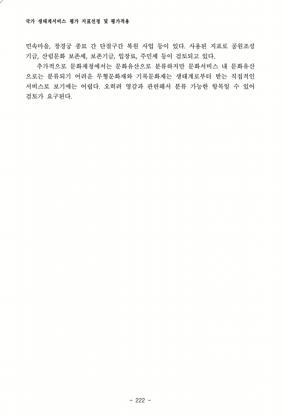 국가 생태계서비스 평가 지표선정 및 평가적용 222 민속마을, 창경궁 종묘 간 단절구간 복원 사업 등이 있다. 사용된 지표로 공원조성 기금, 산림문화 보존세, 보존기금, 입장료, 주민세 등이 검토되고 있다. 추가적으로 문화재청에서는 문화유산으로 분류하지만 문화서비스 내 문화유산 으로는 분류되기 어려운 무형문화재와 기록문화재는 생태계로부터 받는 직접적인 서비스로 보기에는 어렵다. 오히려 영감과 관련해서 분류 가능한 항목일 수 있어 검토가요구된다.