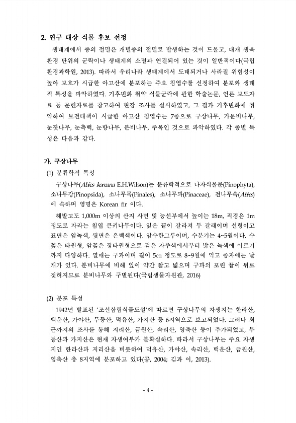 4 2. 연구 대상 식물 후보 선정 생태계에서 종의 절멸은 개별종의 절멸로 발생하는 것이 드물고, 대개 생육 환경 단위의 군락이나 생태계의 소멸과 연결되어 있는 것이 일반적이다 국립 환경과학원, 2013 따라서 우리나라 생태계에서 도태되거나 사라질 위험성이 높아 보호가 시급한 아고산에 분포하는 주요 침엽수룰 선정하여 분포와 생태 적 특성을 파악하였다. 기후변화 취약 식물군락에 관한 학술논문, 언론 보도자 료 등 문헌자료를 참고하여 현장 조사를 실시하였고, 그 결과 기후변화에 취 약하여 보전대책이 시급한 아고산 침엽수는 7종으로 구상나무, 가문비나무, 눈잣나무, 눈측백, 눈향나무, 분비나무, 주목인 것으로 파악하였다. 각 종별 특 성은 다음과 같다. 가. 구상나무 1 분류학적 특성 구상나무 Abies kore...
