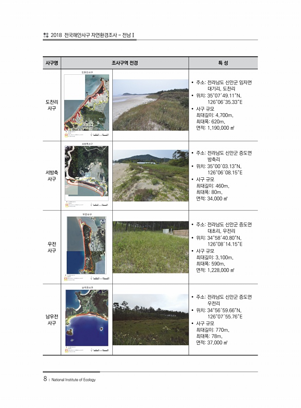2018 전국해안사구 자연환경조사 전남Ⅰ 8 ? National Institute of Ecology 사구명 조사구역 전경 특 성 도찬리 사구 ? 주소전라남도 신안군 임자면 대기리, 도찬리 ? 위치35°07′49.11″N, 126°06′35.33″E ? 사구 규모 최대길이4,700m, 최대폭620m, 면적1,190,000 ㎡ 서방축 사구 ? 주소전라남도 신안군 증도면 방축리 ? 위치35°00′03.13″N, 126°06′08.15″E ? 사구 규모 최대길이460m, 최대폭80m, 면적34,000 ㎡ 우전 사구 ? 주소전라남도 신안군 증도면 대초리, 우전리 ? 위치34°58′40.80″N, 126°08′14.15″E ? 사구 규모 최대길이3,100m, 최대폭590m, 면적1,228,000 ㎡ 남우전 사구 ? ...