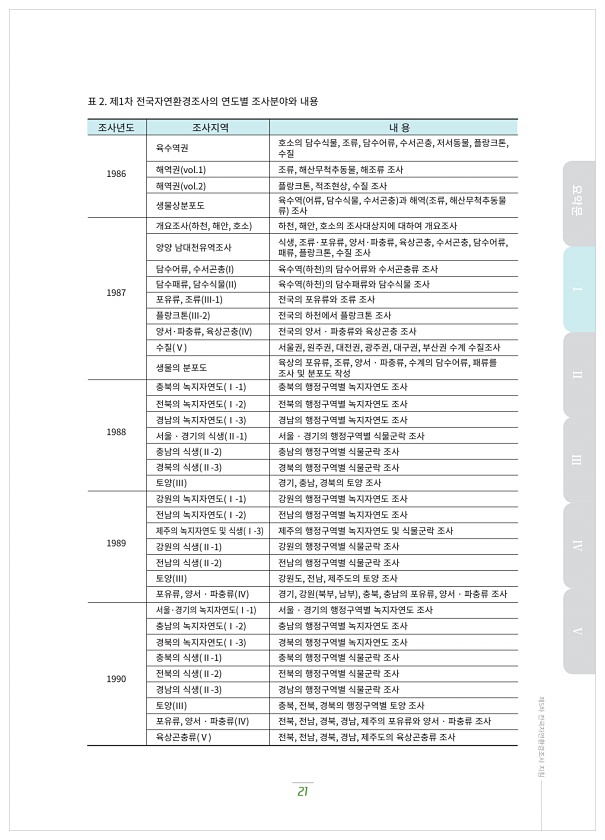 표 2. 제1차?전국자연환경조사의?연도별?조사분야와?내용 조사년도 조사지역 내?용 호소의?담수식물, 조류, 담수어류, 수서곤충, 저서동물, 플랑크톤, 수질 조류, 해산무척추동물, 해조류?조사 플랑크톤, 적조현상, 수질?조사 육수역 어류, 담수식물, 수서곤충 과?해역 조류, 해산무척추동물 류 조사 하천, 해안, 호소의?조사대상지에?대하여?개요조사 식생, 조류·포유류, 양서·파충류, 육상곤충, 수서곤충, 담수어류, 패류, 플랑크톤, 수질?조사 육수역 하천 의?담수어류와?수서곤충류?조사 육수역 하천 의?담수패류와?담수식물?조사 전국의?포유류와?조류?조사 전국의?하천에서?플랑크톤?조사 전국의?양서 · 파충류와?육상곤충?조사 서울권, 원주권, 대전권, 광주권, 대구권, 부산권?수계?수질조사 육상의?포유류, 조류, 양...