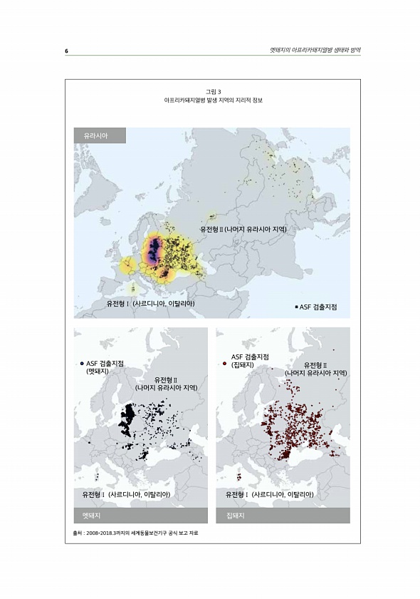 6 멧돼지의 아프리카돼지열병 생태와 방역 출처 2008-2018.3까지의 세계동물보건기구 공식 보고 자료 그림 3 아프리카돼지열병 발생 지역의 지리적 정보 유전형 사르디니아, 이탈리아 유전형 사르디니아, 이탈리아 유전형 사르디니아, 이탈리아 유전형 나머지 유라시아 지역 유전형 나머지 유라시아 지역 유전형 나머지 유라시아 지역 ASF 검출지점 ASF 검출지점 멧돼지 ASF 검출지점 집돼지 유라시아 멧돼지집돼지