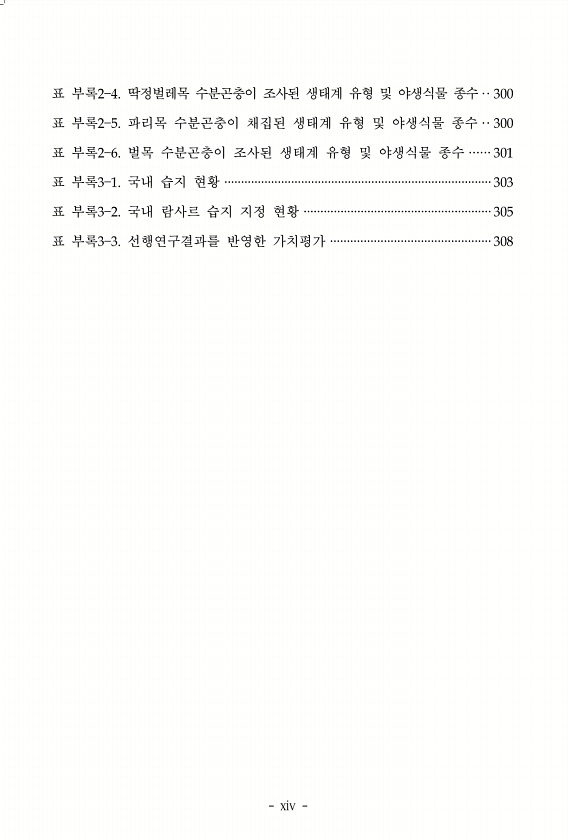 xiv 표 부록2 4. 딱정벌레목 수분곤충이 조사된 생태계 유형 및 야생식물 종수 ·· 300 표 부록2 5. 파리목 수분곤충이 채집된 생태계 유형 및 야생식물 종수 ·· 300 표 부록2 6. 벌목 수분곤충이 조사된 생태계 유형 및 야생식물 종수 ······ 301 표 부록3 1. 국내 습지 현황 ················································································303 표 부록3 2. 국내 람사르 습지 지정 현황 ························································305 표 부록3 3. 선행연구결과를 반영한 가치평가······································...