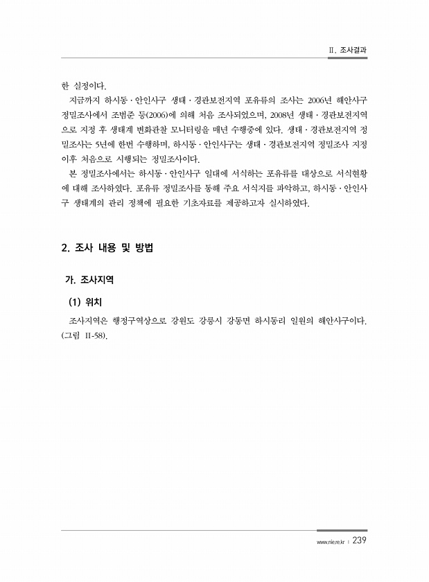 Ⅱ. 조사결과 www.nie.re.kr ? 239 한 실정이다. 지금까지 하시동·안인사구 생태·경관보전지역 포유류의 조사는 2006년 해안사구 정밀조사에서 조범준 등 2006 에 의해 처음 조사되었으며, 2008년 생태·경관보전지역 으로 지정 후 생태계 변화관찰 모니터링을 매년 수행중에 있다. 생태·경관보전지역 정 밀조사는 5년에 한번 수행하며, 하시동·안인사구는 생태·경관보전지역 정밀조사 지정 이후 처음으로 시행되는 정밀조사이다. 본 정밀조사에서는 하시동·안인사구 일대에 서식하는 포유류를 대상으로 서식현황 에 대해 조사하였다. 포유류 정밀조사를 통해 주요 서식지를 파악하고, 하시동·안인사 구 생태계의 관리 정책에 필요한 기초자료를 제공하고자 실시하였다. 2. 조사 내용 및 방법 가. 조사지역 1 위치 조사...