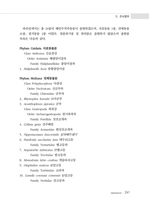 Ⅱ. 조사결과 www.nie.re.kr ? 241 바리섬에서는 총 24종의 해안무척추동물이 출현하였으며, 자포동물 1종, 연체동물 21종, 절지동물 2종 이었다. 멸종위기종 및 희귀종은 출현하지 않았으며 출현종 목록은 다음과 같다. Phylum Cnidaria 자포동물문 Class Anthozoa 산호충강 Order Actiniaria 해변말미잘목 Family Haliplanellidae 줄말미잘과 1. Haliplanella lucia 담황줄말미잘 Phylum Mollusca 연체동물문 Class Polyplacophora 다판강 Order Neoloricata 신군부목 Family Chitonidae 군부과 2. Rhyssoplax kurodai 꼬마군부 3. Acanthopleura japonica 군...