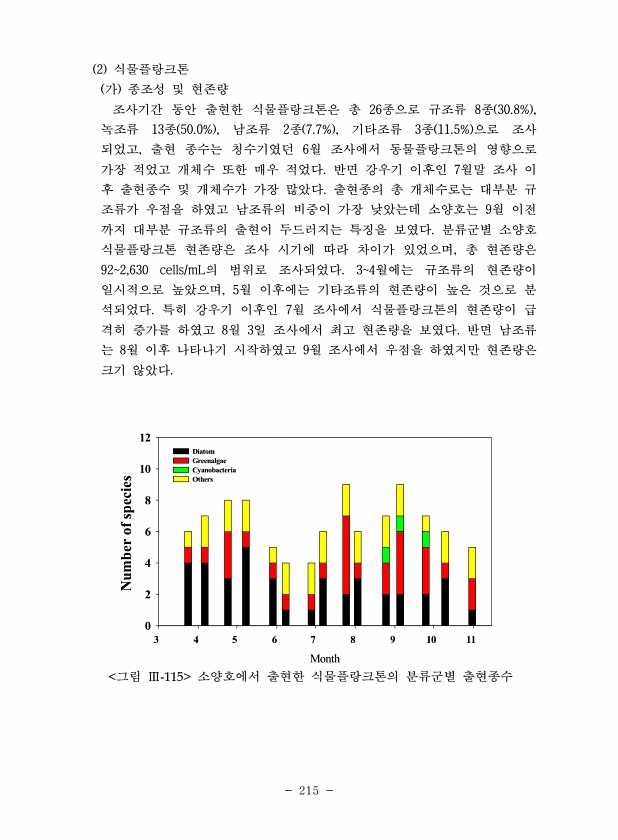 215 2 식물플랑크톤 가 종조성 및 현존량 조사기간 동안 출현한 식물플랑크톤은 총 26종으로 규조류 8종 30.8% , 녹조류 13종 50.0% , 남조류 2종 7.7% , 기타조류 3종 11.5% 으로 조사 되었고, 출현 종수는 청수기였던 6월 조사에서 동물플랑크톤의 영향으로 가장 적었고 개체수 또한 매우 적었다. 반면 강우기 이후인 7월말 조사 이 후 출현종수 및 개체수가 가장 많았다. 출현종의 총 개체수로는 대부분 규 조류가 우점을 하였고 남조류의 비중이 가장 낮았는데 소양호는 9월 이전 까지 대부분 규조류의 출현이 두드러지는 특징을 보였다. 분류군별 소양호 식물플랑크톤 현존량은 조사 시기에 따라 차이가 있었으며, 총 현존량은 922,630 cells/mL의 범위로 조사되었다. 34월에는 규조류의 현...