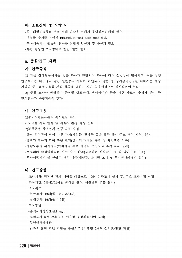 마 소요장비 및 시약 등 중 대형포유류의 서식 실체 파악을 위해서 무인센서카메라 필요 배설물 수거를 위해서 필요 무산쇠족제비 행동권 연구를 위해서 발신기 및 수신기 필요 야간 행동권 조사장비로 렌턴 헬멧 필요 종합연구 계획 가 연구목적 기존 선행연구에서는 청문 조사가 포함되어 조사에 다소 신빙성이 떨어지고 최근 선행 연구에서는 너구리와 같은 일반종의 서식이 확인되지 않는 등 장기생태연구를 위해서는 해당 지역의 중 대형포유류 서식 현황에 대한 조사가 최우선적으로 실시되어야 한다 현황 조사와 병행하여 분야별 상호관계 생태먹이망 등을 위한 자료의 수집과 분석 등 연계연구가 수행되어야 한다 나 연구내용 중 대형포유류의 서식현황 파악 포유류 서식 현황 및 서식지 환경 특성 분석 분류군별 상호연계 연구 자료 수집 삵과...