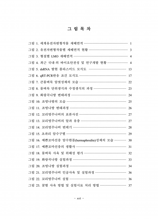 xvii 그 림 목 차 그림 1. 세계유전자변형작물 재배면적 ······················································· 1 그림 2. 유전자변형작물별 재배면적 현황 ················································ 3 그림 3. 형질별 LMO 재배면적 ···································································· 4 그림 4. 최근 국내·외 바이오안전성 및 연구개발 현황 ························· 4 그림 5. dsRNA 발현 플라스미드 모식도 ·············································· 13 그림 6. qRT-...