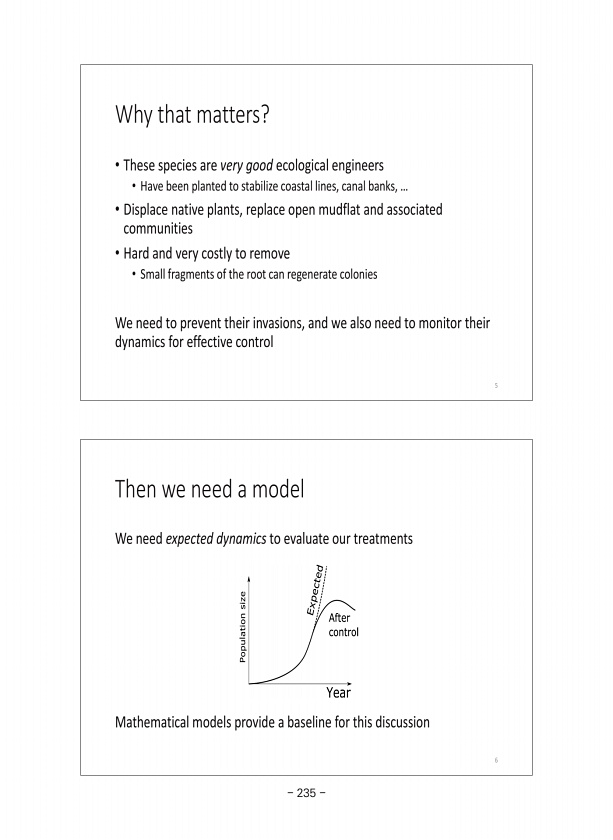 Then we need a model We need expected dynamics to evaluate our treatments Mathematical models provide a baseline for this discussion 6 Why that matters? ? These species are very good ecological engineers ? Have been planted to stabilize coastal lines, canal banks, … ? Displace native plants, replace open mudflat and associated communities ? Hard and very costly to remove ? Small fragments of the r...