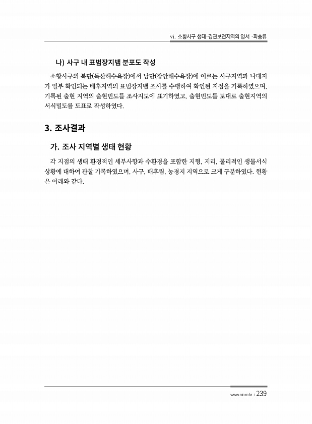 vi. 소황사구 생태·경관보전지역의 양서 ·파충류 www.nie.re.kr ?239 소황사구의 북단 독산해수욕장 에서 남단 장안해수욕장 에 이르는 사구지역과 나대지 가 일부 확인되는 배후지역의 표범장지뱀 조사를 수행하여 확인된 지점을 기록하였으며, 기록된 출현 지역의 출현빈도를 조사지도에 표기하였고, 출현빈도를 토대로 출현지역의 서식밀도를 도표로 작성하였다. 3. 각 지점의 생태 환경적인 세부사항과 수환경을 포함한 지형, 지리, 물리적인 생물서식 상황에 대하여 관찰 기록하였으며, 사구, 배후림, 농경지 지역으로 크게 구분하였다. 현황 은 아래와같다.