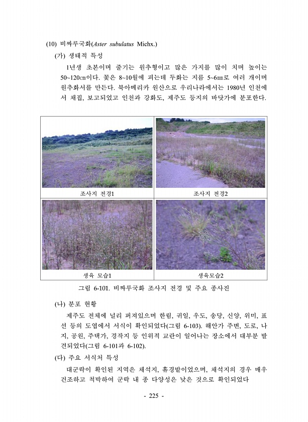 225 10 비짜루국화 Aster subulatus Michx. 가 생태적 특성 1년생 초본이며 줄기는 원추형이고 많은 가지를 많이 치며 높이는 50120㎝이다. 꽃은 810월에 피는데 두화는 지름 56㎜로 여러 개이며 원추화서를 만든다. 북아메리카 원산으로 우리나라에서는 1980년 인천에 서 채집, 보고되었고 인천과 강화도, 제주도 등지의 바닷가에 분포한다. 조사지 전경1 조사지 전경2 생육 모습1 생육모습2 그림 6-101. 비짜루국화 조사지 전경 및 주요 종사진 나 분포 현황 제주도 전체에 널리 퍼져있으며 한림, 귀일, 우도, 송당, 신양, 위미, 표 선 등의 도엽에서 서식이 확인되었다 그림 6-103 해안가 주변, 도로, 나 지, 공원, 주택가, 경작지 등 인위적 교란이 일어나는 장소에서 대부분 발 ...