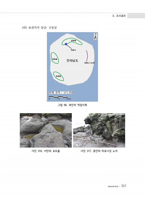 Ⅱ. 조사결과 www.nie.re.kr ? 241 라 보전가치 등급Ⅱ등급 그림 96. 북안의 역질사취 사진 316. 서안의 포트홀 사진 317. 동안의 타포니성노치