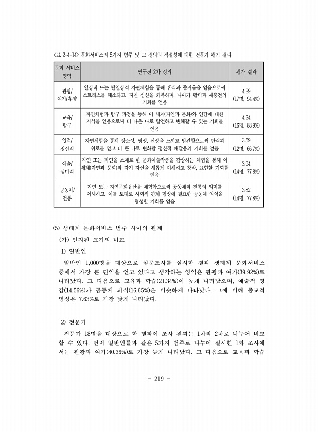 219 문화 서비스 영역 연구진 2차 정의 평가 결과 관광/ 여가/휴양 일상적 또는 탈일상적 자연체험을 통해 휴식과 즐거움을 얻음으로써 스트레스를 해소하고, 지친 심신을 회복하며, 나아가 활력과 재충전의 기회를 얻음 4.29 17명, 94.4% 교육/ 탐구 자연체험과 탐구 과정을 통해 이 세계 자연과 문화 와 인간에 대한 지식을 얻음으로써 더 나은 나로 발전하고 변해갈 수 있는 기회를 얻음 4.24 16명, 88.9% 영적/ 정신적 자연체험을 통해 장소성, 영성, 신성을 느끼고 발견함으로써 안식과 위로를 얻고 더 큰 나로 변화할 정신적 깨달음의 기회를 얻음 3.59 12명, 66.7% 예술/ 심미적 자연 또는 자연을 소재로 한 문화예술작품을 감상하는 체험을 통해 이 세계 자연과 문화 와 자기 자신을 새롭게 ...