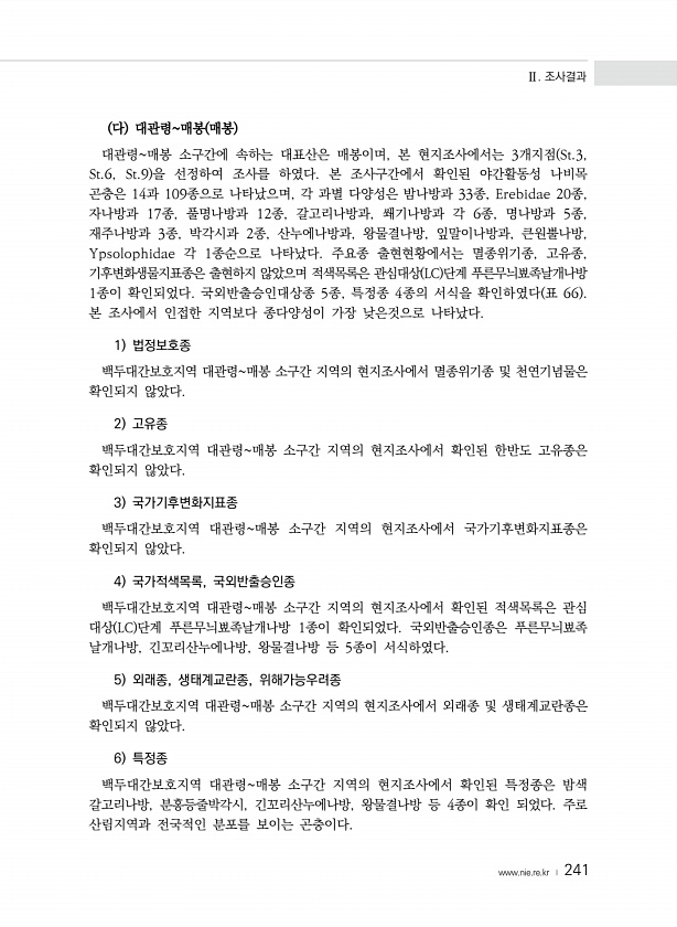 Ⅱ. 조사결과 www.nie.re.kr ? 241 다 대관령매봉 매봉 대관령매봉 소구간에 속하는 대표산은 매봉이며, 본 현지조사에서는 3개지점 St.3, St.6, St.9 을 선정하여 조사를 하였다. 본 조사구간에서 확인된 야간활동성 나비목 곤충은 14과 109종으로 나타났으며, 각 과별 다양성은 밤나방과 33종, Erebidae 20종, 자나방과 17종, 풀명나방과 12종, 갈고리나방과, 쐐기나방과 각 6종, 명나방과 5종, 재주나방과 3종, 박각시과 2종, 산누에나방과, 왕물결나방, 잎말이나방과, 큰원뿔나방, Ypsolophidae 각 1종순으로 나타났다. 주요종 출현현황에서는 멸종위기종, 고유종, 기후변화생물지표종은 출현하지 않았으며 적색목록은 관심대상 LC 단계 푸른무늬뾰족날개나방 1종이 확인되었다...