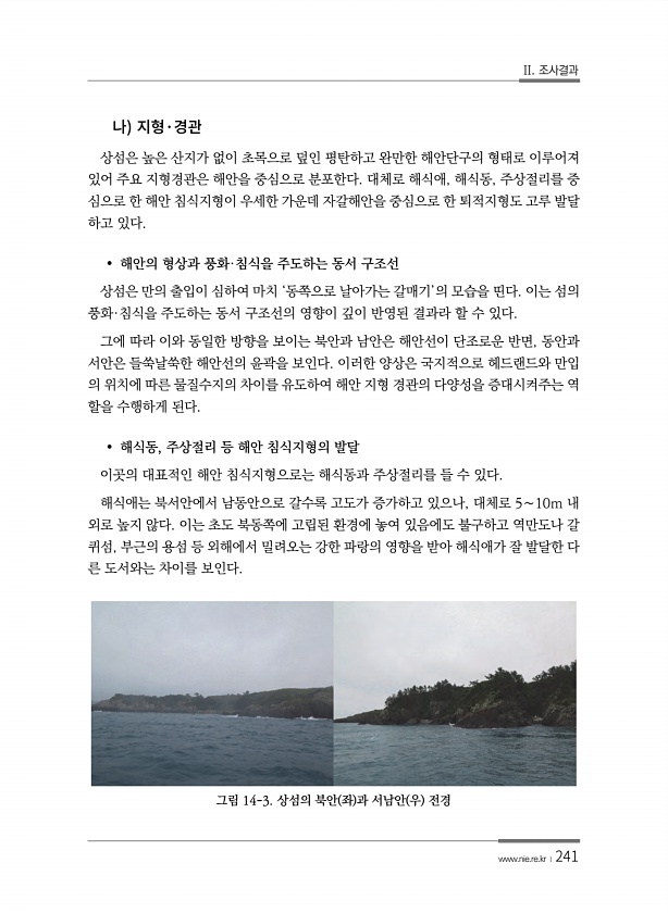 II. 조사결과 www.nie.re.kr ?241 · 상섬은 높은 산지가 없이 초목으로 덮인 평탄하고 완만한 해안단구의 형태로 이루어져 있어 주요 지형경관은 해안을 중심으로 분포한다. 대체로 해식애, 해식동, 주상절리를 중 심으로 한 해안 침식지형이 우세한 가운데 자갈해안을 중심으로 한 퇴적지형도 고루 발달 하고 있다. ? 해안의 형상과 풍화·침식을 주도하는 동서 구조선 상섬은 만의 출입이 심하여 마치 ‘동쪽으로 날아가는 갈매기’의 모습을 띤다. 이는 섬의 풍화·침식을 주도하는 동서 구조선의 영향이 깊이 반영된 결과라 할 수 있다. 그에 따라 이와 동일한 방향을 보이는 북안과 남안은 해안선이 단조로운 반면, 동안과 서안은 들쑥날쑥한 해안선의 윤곽을 보인다. 이러한 양상은 국지적으로 헤드랜드와 만입 의 위치에...