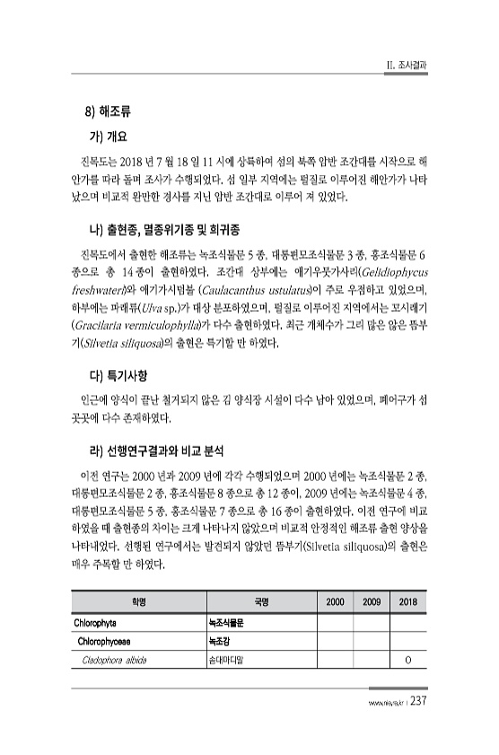 II. 조사결과 www.nie.re.kr ?237 8 진목도는 2018 년 7 월 18 일 11 시에 상륙하여 섬의 북쪽 암반 조간대를 시작으로 해 안가를 따라 돌며 조사가 수행되었다. 섬 일부 지역에는 펄질로 이루어진 해안가가 나타 났으며 비교적 완만한 경사를 지닌 암반 조간대로 이루어 져 있었다. , 진목도에서 출현한 해조류는 녹조식물문 5 종, 대롱편모조식물문 3 종, 홍조식물문 6 종으로 총 14 종이 출현하였다. 조간대 상부에는 애기우뭇가사리 Gelidiophycus freshwateri 와 애기가시덤불 Caulacanthus ustulatus 이 주로 우점하고 있었으며, 하부에는 파래류 Ulva sp. 가 대상 분포하였으며, 펄질로 이루어진 지역에서는 꼬시래기 Gracilaria vermiculo...