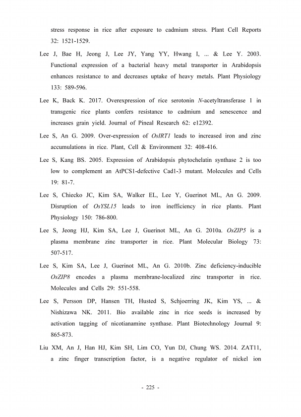 225 stress response in rice after exposure to cadmium stress. Plant Cell Reports 321521-1529. Lee J, Bae H, Jeong J, Lee JY, Yang YY, Hwang I, ... & Lee Y. 2003. Functional expression of a bacterial heavy metal transporter in Arabidopsis enhances resistance to and decreases uptake of heavy metals. Plant Physiology 133589-596. Lee K, Back K. 2017. Overexpression of rice serotonin N-acetyltransferas...