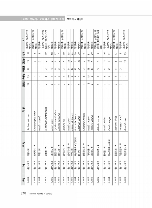 240 목명 과명 국 명 학 명 선달산 옥돌봉 구룡산 신선봉 합계 비고 나비목 네발나비과 대왕나비 Sephisa princeps 27 25 49 28 129 국외반출 승인대상,적 색목록 나비목 네발나비과 도시처녀나비 Coenonympha hero 3 3 국외반출 승인대상,적 색목록 나비목 네발나비과 두줄나비 Neptis rivularis 1 2 3 적색목록 나비목 네발나비과 들신선나비 Nymphalis xanthomelas 2 3 3 2 10 국외반출 승인대상,유 용곤충_화분매개,적색 목록 나비목 네발나비과 먹그늘나비 Lethe diana 2 3 3 2 10 적색목록 나비목 네발나비과 물결나비 Ypthima multistriata 2 1 8 6 17 적색목록 나비목 네발나비과 뱀눈그늘나비 ...