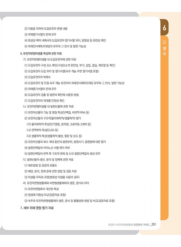 환경부 유전자변형생물체 안전관리 가이드 _251 6 별 표 3 2 이용을 위하여 도입유전자 변형 내용 3 위해염기서열의 존재 유무 4 완성된 벡터 내에서의 도입유전자 염기서열 위치, 방향성 등 완전성 확인 5 외래전사해독프레임의 유무와 그 전사 및 발현 가능성 6. 유전자변형미생물 특성에 관한 자료 가. 유전자변형미생물 내 도입유전자에 관한 자료 1 도입유전자 구성 요소 확인 구성요소의 완전성, 부가, 삽입, 결실, 재조합 등 확인 2 도입유전자 도입 위치 및 염기서열 숙주 게놈 주변 염기서열 포함 3 도입유전자의 복제수 4 도입유전자 및 인접 숙주 게놈 유전자의 외래전사해독프레임 유무와 그 전사, 발현 가능성 5 위해염기서열의 존재 유무 6 도입유전자 검출 및 발현의 확인에 사용된 방법 7 도입유전자의 계...