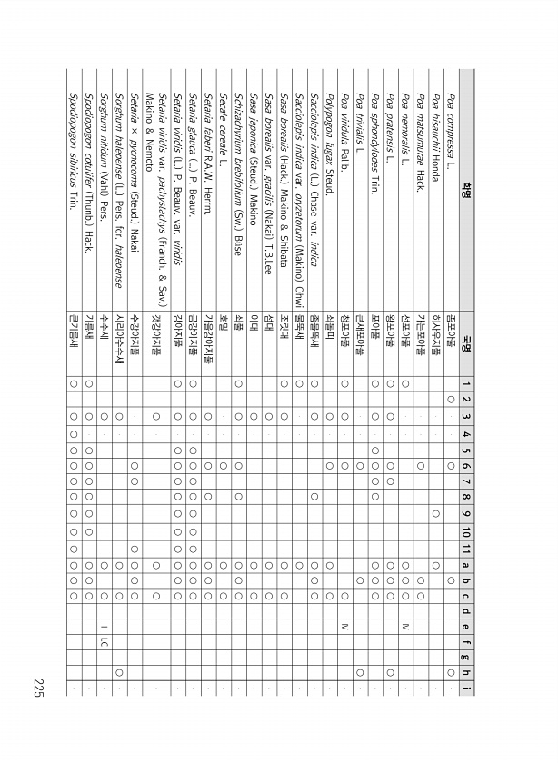 225 학명 국명 1 2 3 4 5 6 7 8 9 10 11 a b c d e f g h i Poa compressa L. 좀포아풀 ○ ○ ○ ○ Poa hisauchii Honda 히사우지풀 ○ ○ Poa matsumurae Hack. 가는포아풀 ○ ○ ○ Poa nemoralis L. 선포아풀 ○ ○ ○ ○ Ⅳ Poa pratensis L. 왕포아풀 ○ ○ ○ ○ ○ ○ ○ ○ Poa sphondylodes Trin. 포아풀 ○ ○ ○ ○ ○ ○ ○ ○ ○ Poa trivialis L. 큰새포아풀 ○ ○ ○ Poa viridula Palib. 청포아풀 ○ ○ ○ ○ Ⅳ Polypogon fugax Steud. 쇠돌피 ○ ○ ○ ○ Sacciolepis indica L. Chase var. indica 좀...