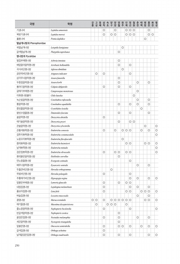 250 기생나비 Leptidea amurensis ○ ○ ○ ○ ○ ○ 북방기생나비 Leptidea morsei ○ ○ ○ ○ ○ ○ ○ ○ 풀흰나비 Pontia daplidice ○ 털날개나방과 Pterophoridae 쑥털날개나방 Leioptilu lienigianus ○ 갈색털날개나방 Platyptilia taprobanes ○ 명나방과 Pyralidae 벌집부채명나방 Achroia innotata ○ 배잎말이알락명나방 Acrobasis hollandella ○ ○ 곡식비단명나방 Aglossa dimidiata ○ 굵은띠비단명나방 Arippara indicator ○ ○ ○ 삼각무늬알락명나방 Assara funerella ○ 두흰점알락명나방 Assara korbi ○ ○ ○ 통마디알락명나방 Calgui...