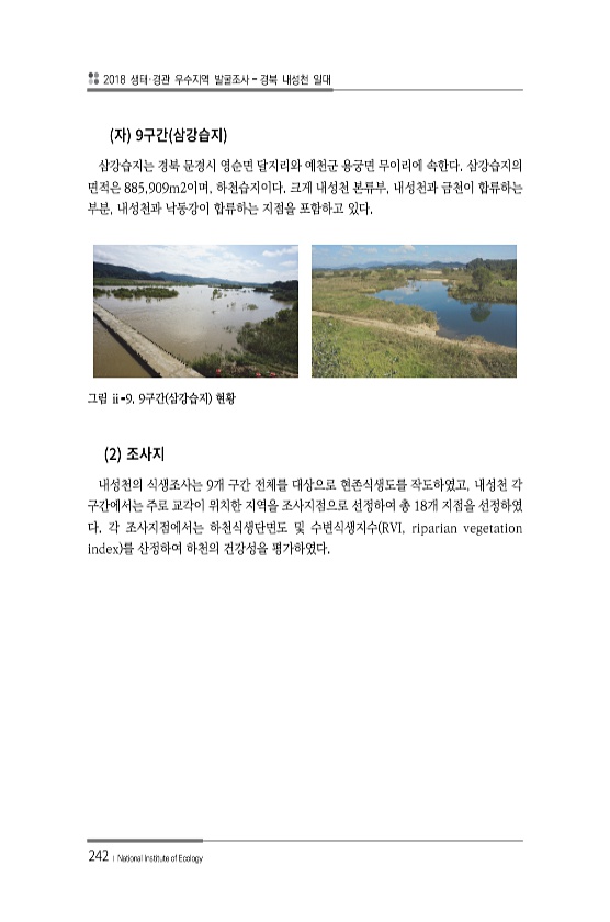 2018 생태·경관 우수지역 발굴조사 경북 내성천 일대 242 ? National Institute of Ecology 9 삼강습지는 경북 문경시 영순면 달지리와 예천군 용궁면 무이리에 속한다. 삼강습지의 면적은 885,909m2이며, 하천습지이다. 크게 내성천 본류부, 내성천과 금천이 합류하는 부분, 내성천과 낙동강이 합류하는 지점을 포함하고 있다. 그림 ⅱ-9. 9구간 삼강습지 현황 2 내성천의 식생조사는 9개 구간 전체를 대상으로 현존식생도를 작도하였고, 내성천 각 구간에서는 주로 교각이 위치한 지역을 조사지점으로 선정하여 총 18개 지점을 선정하였 다. 각 조사지점에서는 하천식생단면도 및 수변식생지수 RVI, riparian vegetation index 를 산정하여 하천의 건강성을평가하였다.