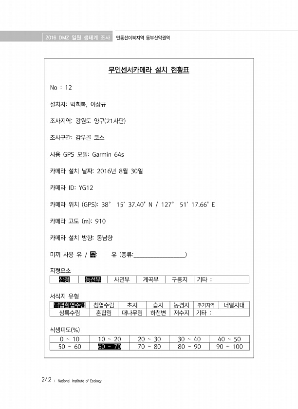 2016 DMZ 일원 생태계 조사 민통선이북지역 동부산악권역 242 ? National Institute of Ecology 무인센서카메라 설치 현황표 No 12 설치자박희복, 이상규 조사지역강원도 양구 21사단 조사구간감우골 코스 사용 GPS 모델Garmin 64s 카메라 설치 날짜2016년 8월 30일 카메라 IDYG12 카메라 위치 GPS 38° 15’ 37.40N 127° 51’ 17.66E 카메라 고도 m 910 카메라 설치 방향동남향 미끼 사용 유 무유 종류__________________ 지형요소 산정 능선부 사면부 계곡부 구릉지 기타 서식지 유형 낙엽활엽수림 침엽수림 초지 습지 농경지 주거지역 너덜지대 상록수림 혼합림 대나무림 하천변 저수지 기타 식생피도 % 0 10 10 20 20 30 30...