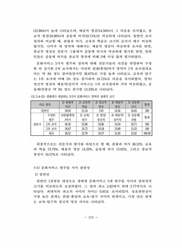 220 22.86% 이 높게 나타났으며, 예술적 영감 14.50% 이 그 다음을 차지했고, 종 교적 영성 10.86% 과 공동체 의식 10.71% 은 비슷하게 나타났다. 일반인 조사 결과와 비교할 때, 관광과 여가, 교육과 학습은 크기와 순서가 매우 비슷하 였지만, 나머지 세 영역에 대해서는 예술적 영감이 비슷하게 조사된 반면, 종교적 영성은 전문가 그룹에서 공동체 의식과 비슷하게 평가된 반면, 일반 인들은 공동체 의식을 종교적 영성에 비해 2배 이상 많게 평가하였다. 문화서비스 5가지 범주와 정의에 대해 전문가들의 의견을 반영하여 수정 한 뒤 실시한 2차 조사에서는 여전히 관광/휴양/여가 영역이 1차 조사결과보 다는 약 4% 정도 줄어들었지만 36.67%로 가장 높게 나타났고, 교육과 탐구 는 1차 조사에...
