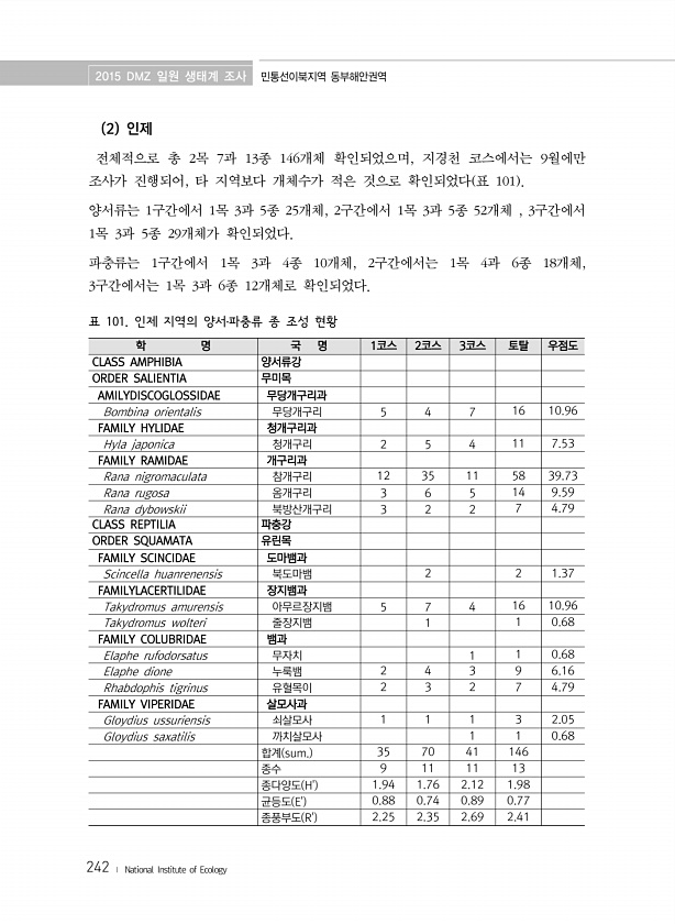 2015 DMZ 일원 생태계 조사 민통선이북지역 동부해안권역 242 ? National Institute of Ecology 2 인제 전체적으로 총 2목 7과 13종 146개체 확인되었으며, 지경천 코스에서는 9월에만 조사가 진행되어, 타 지역보다 개체수가 적은 것으로 확인되었다 표 101 양서류는 1구간에서 1목 3과 5종 25개체, 2구간에서 1목 3과 5종 52개체 , 3구간에서 1목 3과 5종 29개체가 확인되었다. 파충류는 1구간에서 1목 3과 4종 10개체, 2구간에서는 1목 4과 6종 18개체, 3구간에서는 1목 3과 6종 12개체로 확인되었다. 학 명 국 명 1코스 2코스 3코스 토탈 우점도 CLASS AMPHIBIA 양서류강 ORDER SALIENTIA 무미목 AMILYDISCOGLOSSID...