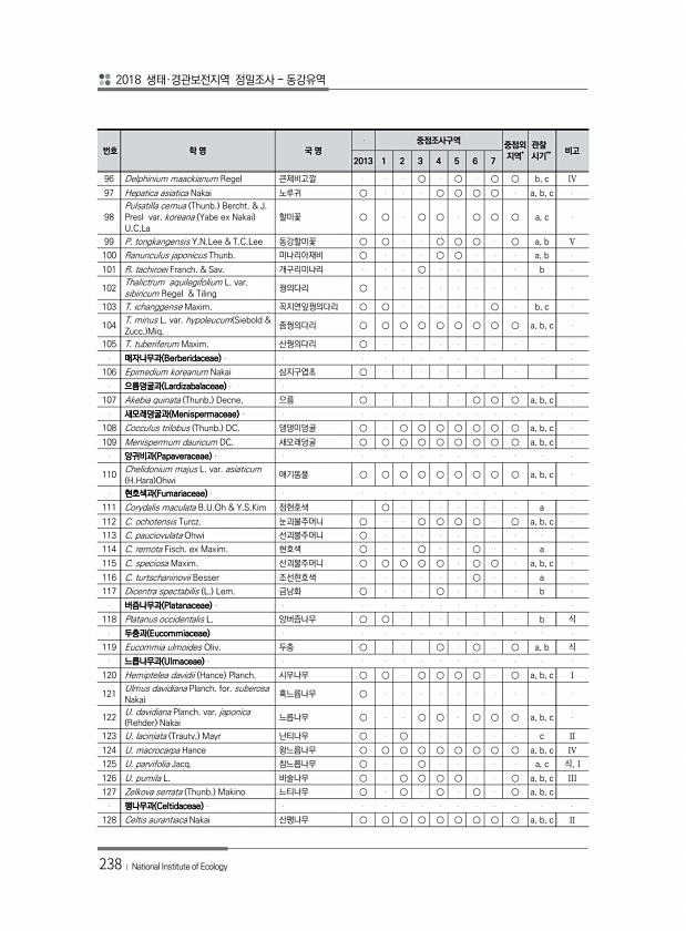 2018 생태·경관보전지역 정밀조사 동강유역 238 ? National Institute of Ecology 번호 학 명 국 명 중점조사구역 중점외 지역* 관찰 시기** 비고 2013 1 2 3 4 5 6 7 96 Delphinium maackianum Regel 큰제비고깔 ○ ○ ○ ○ b, c IV 97 Hepatica asiatica Nakai 노루귀 ○ ○ ○ ○ ○ a, b, c 98 Pulsatilla cernua Thunb. Bercht. & J. Presl var. koreana Yabe ex Nakai U.C.La 할미꽃 ○ ○ ○ ○ ○ ○ ○ a, c 99 P. tongkangensis Y.N.Lee & T.C.Lee 동강할미꽃 ○ ○ ○ ○...