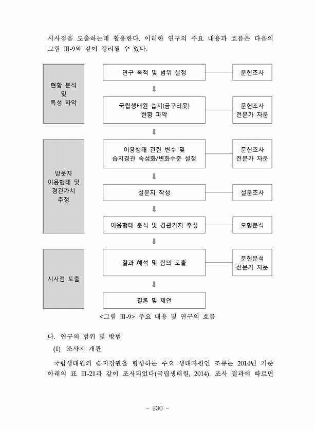 230 시사점을 도출하는데 활용한다 이러한 연구의 주요 내용과 흐름은 다음의 그림 와 같이 정리될 수 있다 현황 분석 및 특성 파악 연구 목적 및 범위 설정 문헌조사 ? 국립생태원 습지 금구리못 현황 파악 문헌조사 전문가 자문 ? 방문자 이용행태 및 경관가치 추정 이용행태 관련 변수 및 습지경관 속성화/변화수준 설정 문헌조사 전문가 자문 ? 설문지 작성 설문조사 ? 이용행태 분석 및 경관가치 추정 모형분석 ? 시사점 도출 결과 해석 및 함의 도출 문헌분석 전문가 자문 ? 결론 및 제언 그림 주요 내용 및 연구의 흐름 나 연구의 범위 및 방법 조사지 개관 국립생태원의 습지경관을 형성하는 주요 생태자원인 조류는 년 기준 아래의 표 과 같이 조사되었다 국립생태원 조사 결과에따르면