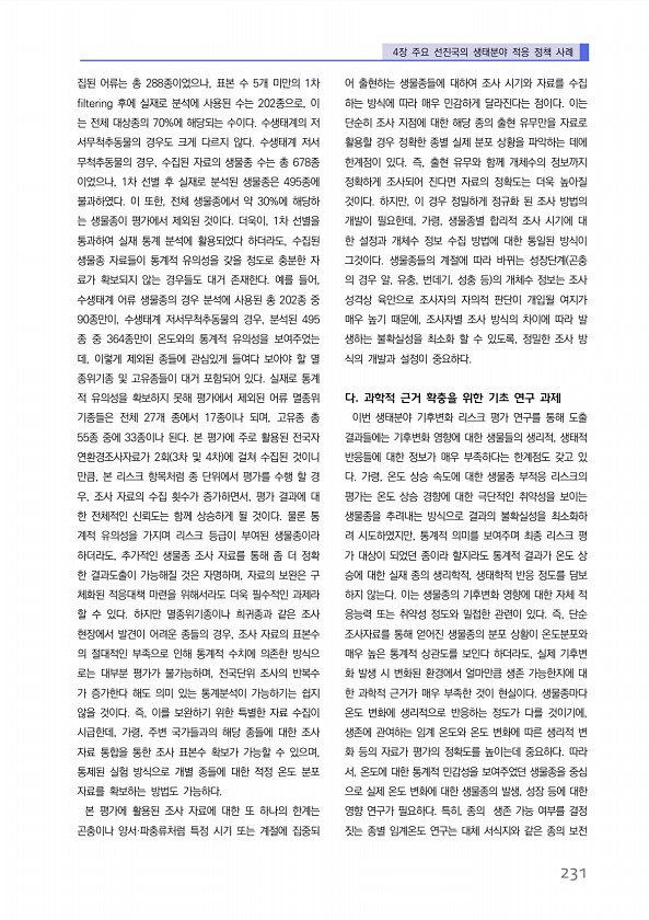 4장 주요 선진국의 생태분야 적응 정책 사례 231 집된 어류는 총 288종이었으나, 표본 수 5개 미만의 1차 filtering 후에 실재로 분석에 사용된 수는 202종으로, 이 는 전체 대상종의 70%에 해당되는 수이다. 수생태계의 저 서무척추동물의 경우도 크게 다르지 않다. 수생태계 저서 무척추동물의 경우, 수집된 자료의 생물종 수는 총 678종 이었으나, 1차 선별 후 실재로 분석된 생물종은 495종에 불과하였다. 이 또한, 전체 생물종에서 약 30%에 해당하 는 생물종이 평가에서 제외된 것이다. 더욱이, 1차 선별을 통과하여 실재 통계 분석에 활용되었다 하더라도, 수집된 생물종 자료들이 통계적 유의성을 갖을 정도로 충분한 자 료가 확보되지 않는 경우들도 대거 존재한다. 예를 들어, 수생태계 어류 생...