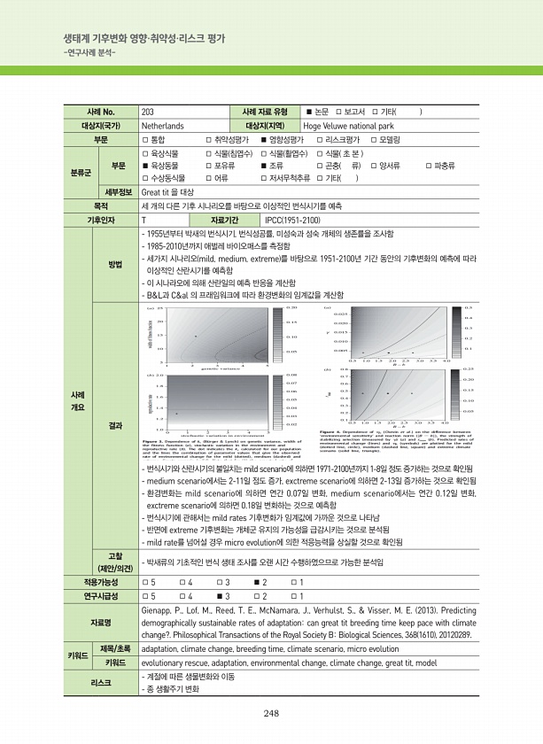 248 생태계 기후변화 영향·취약성·리스크 평가 -연구사례 분석- 사례 No. 203 사례 자료 유형 ■ 논문 □ 보고서 □ 기타 대상지 국가 Netherlands 대상지 지역 Hoge Veluwe national park 부문 □ 통합 □ 취약성평가 ■ 영향성평가 □ 리스크평가 □ 모델링 분류군 부문 □ 육상식물 □ 식물 침엽수 □ 식물 활엽수 □ 식물 초 본 ■ 육상동물 □ 포유류 ■ 조류 □ 곤충 류 □ 양서류 □ 파충류 □ 수상동식물 □ 어류 □ 저서무척추류 □ 기타 세부정보 Great tit 을 대상 목적 세 개의 다른 기후 시나리오를 바탕으로 이상적인 번식시기를 예측 기후인자 T 자료기간 IPCC 1951-2100 사례 개요 방법 1955년부터 박새의 번식시기, 번식성공률, 미성숙과 성숙 개체의 ...