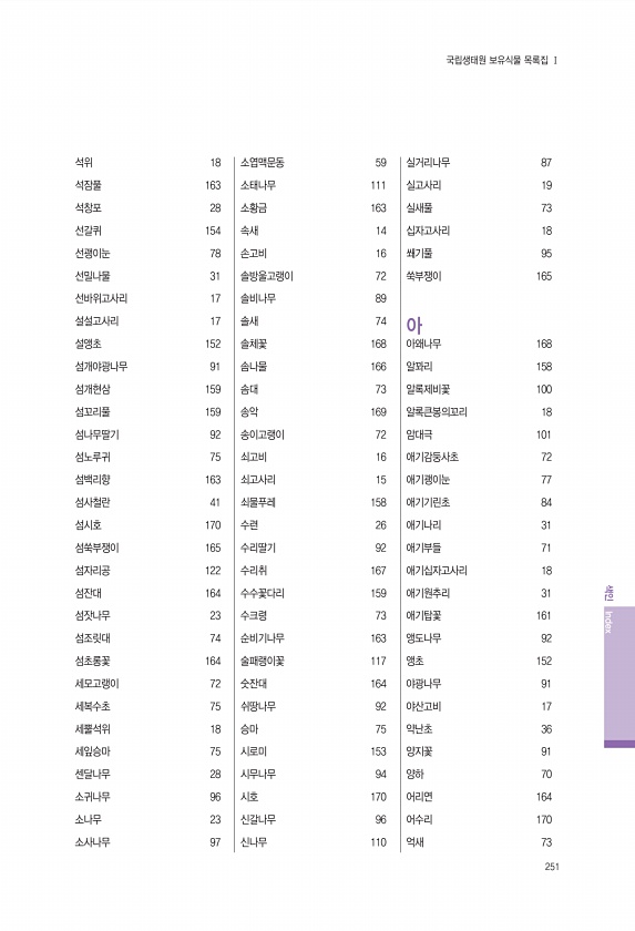 251 색인 Index 국립생태원 보유식물 목록집 Ⅰ 석위 18 석잠풀 163 석창포 28 선갈퀴 154 선괭이눈 78 선밀나물 31 선바위고사리 17 설설고사리 17 설앵초 152 섬개야광나무 91 섬개현삼 159 섬꼬리풀 159 섬나무딸기 92 섬노루귀 75 섬백리향 163 섬사철란 41 섬시호 170 섬쑥부쟁이 165 섬자리공 122 섬잔대 164 섬잣나무 23 섬조릿대 74 섬초롱꽃 164 세모고랭이 72 세복수초 75 세뿔석위 18 세잎승마 75 센달나무 28 소귀나무 96 소나무 23 소사나무 97 소엽맥문동 59 소태나무 111 소황금 163 속새 14 손고비 16 솔방울고랭이 72 솔비나무 89 솔새 74 솔체꽃 168 솜나물 166 솜대 73 송악 169 송이고랭이 72 쇠고비 16 쇠고사리...