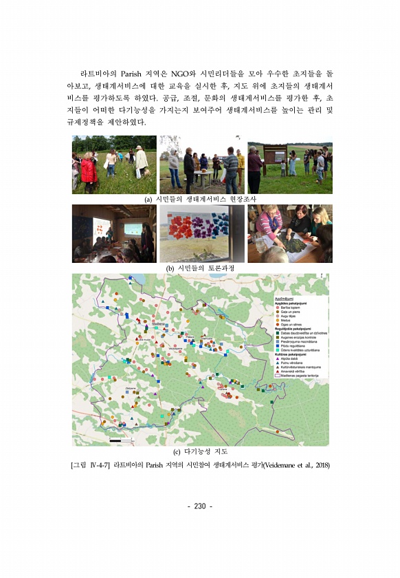 230 라트비아의 Parish 지역은 NGO와 시민리더들을 모아 우수한 초지들을 돌 아보고, 생태계서비스에 대한 교육을 실시한 후, 지도 위에 초지들의 생태계서 비스를 평가하도록 하였다. 공급, 조절, 문화의 생태계서비스를 평가한 후, 초 지들이 어떠한 다기능성을 가지는지 보여주어 생태계서비스를 높이는 관리 및 규제정책을 제안하였다. a 시민들의 생태계서비스 현장조사 b 시민들의 토론과정 c 다기능성 지도 [그림 Ⅳ-4-7] 라트비아의 Parish 지역의 시민참여 생태계서비스 평가 Veidemane et al., 2018