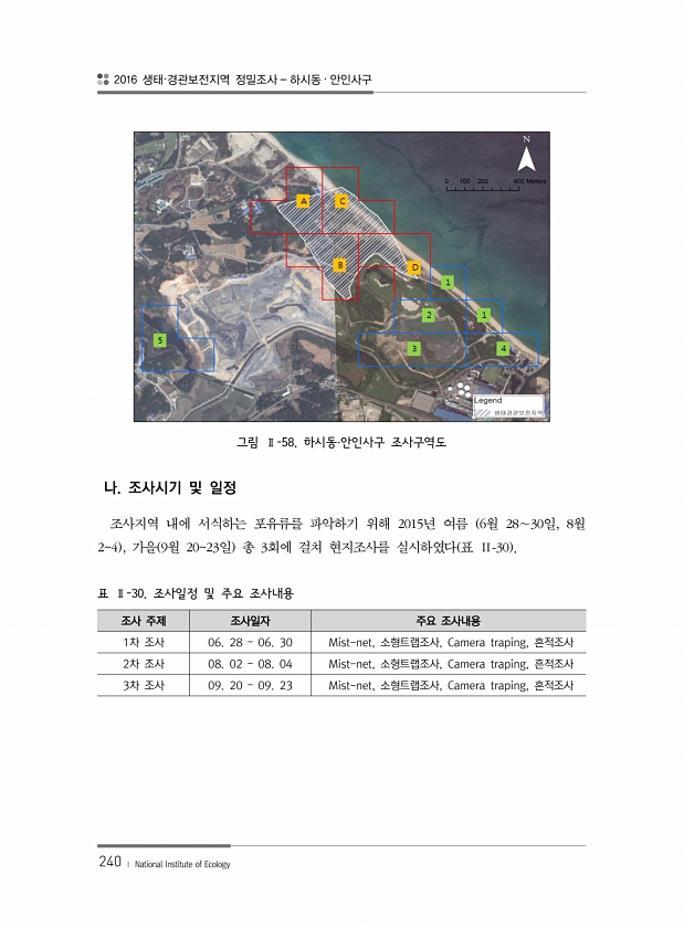 2016 생태·경관보전지역 정밀조사 하시동 · 안인사구 240 ? National Institute of Ecology 그림 Ⅱ-58. 하시동·안인사구 조사구역도 나. 조사시기 및 일정 조사지역 내에 서식하는 포유류를 파악하기 위해 2015년 여름 6월 28∼30일, 8월 24 , 가을 9월 2023일 총 3회에 걸쳐 현지조사를 실시하였다 표 Ⅱ-30 조사 주제 조사일자 주요 조사내용 1차 조사 06. 28 ? 06. 30 Mist-net, 소형트랩조사, Camera traping, 흔적조사 2차 조사 08. 02 ? 08. 04 Mist-net, 소형트랩조사, Camera traping, 흔적조사 3차 조사 09. 20 ? 09. 23 Mist-net, 소형트랩조사, Camera traping, 흔적조사 ...