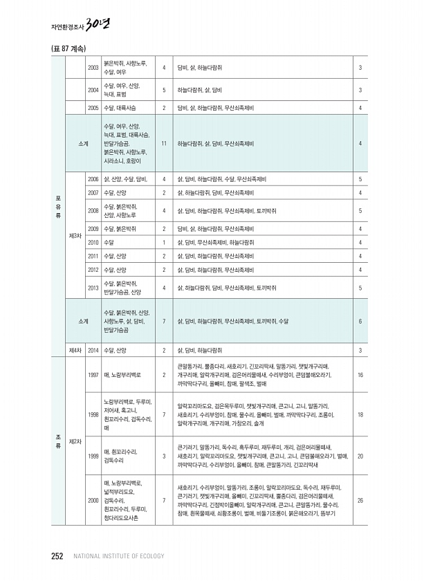 포 유 류 2003 붉은박쥐, 사향노루, 수달, 여우 4 담비, 삵, 하늘다람쥐 3 2004 수달, 여우, 산양, 늑대, 표범 5 하늘다람쥐, 삵, 담비 3 2005 수달, 대륙사슴 2 담비, 삵, 하늘다람쥐, 무산쇠족제비 4 소계 수달, 여우, 산양, 늑대, 표범, 대륙사슴, 반달가슴곰, 붉은박쥐, 사향노루, 시라소니, 호랑이 11 하늘다람쥐, 삵, 담비, 무산쇠족제비 4 제3차 2006 삵, 산양, 수달, 담비, 4 삵, 담비, 하늘다람쥐, 수달, 무산쇠족제비 5 2007 수달, 산양 2 삵, 하늘다람쥐, 담비, 무산쇠족제비 4 2008 수달, 붉은박쥐, 산양, 사향노루 4 삵, 담비, 하늘다람쥐, 무산쇠족제비, 토끼박쥐 5 2009 수달, 붉은박쥐 2 담비, 삵, 하늘다람쥐, 무산쇠족제비 4 2010 ...