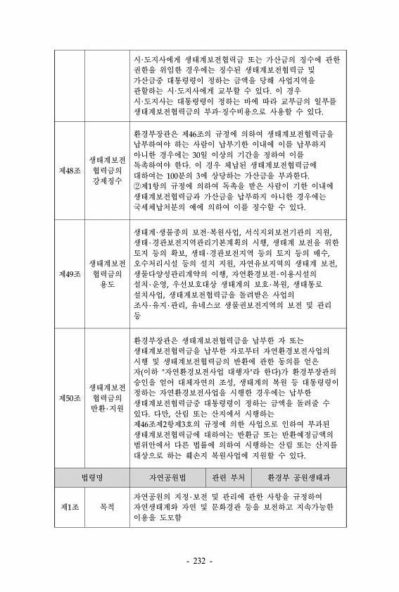 시·도지사에게 생태계보전협력금 또는 가산금의 징수에 관한 권한을 위임한 경우에는 징수된 생태계보전협력금 및 가산금중 대통령령이 정하는 금액을 당해 사업지역을 관할하는 시·도지사에게 교부할 수 있다. 이 경우 시·도지사는 대통령령이 정하는 바에 따라 교부금의 일부를 생태계보전협력금의 부과·징수비용으로 사용할 수 있다. 제48조 생태계보전 협력금의 강제징수 환경부장관은 제46조의 규정에 의하여 생태계보전협력금을 납부하여야 하는 사람이 납부기한 이내에 이를 납부하지 아니한 경우에는 30일 이상의 기간을 정하여 이를 독촉하여야 한다. 이 경우 체납된 생태계보전협력금에 대하여는 100분의 3에 상당하는 가산금을 부과한다. ②제1항의 규정에 의하여 독촉을 받은 사람이 기한 이내에 생태계보전협력금과 가산금을 납부하지 아...